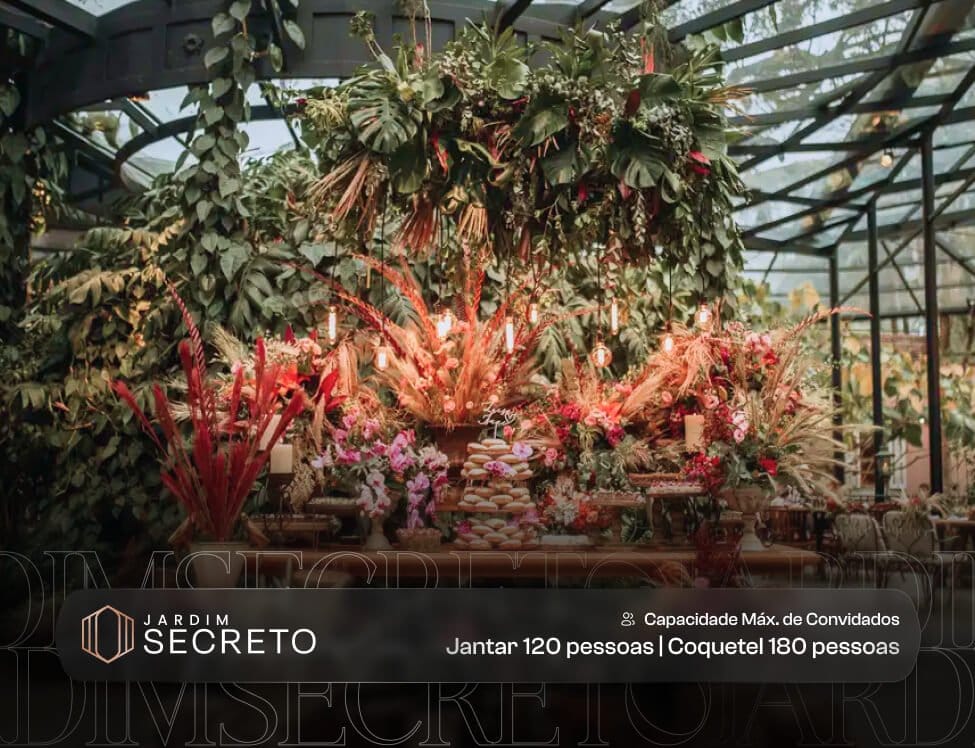 Viva todo o encanto do espaço Jardim Secreto: Ambiente inspirador, natureza deslumbrante, arquitetura única com grande destaque para cobertura em vidro e jardim vertical suspenso.